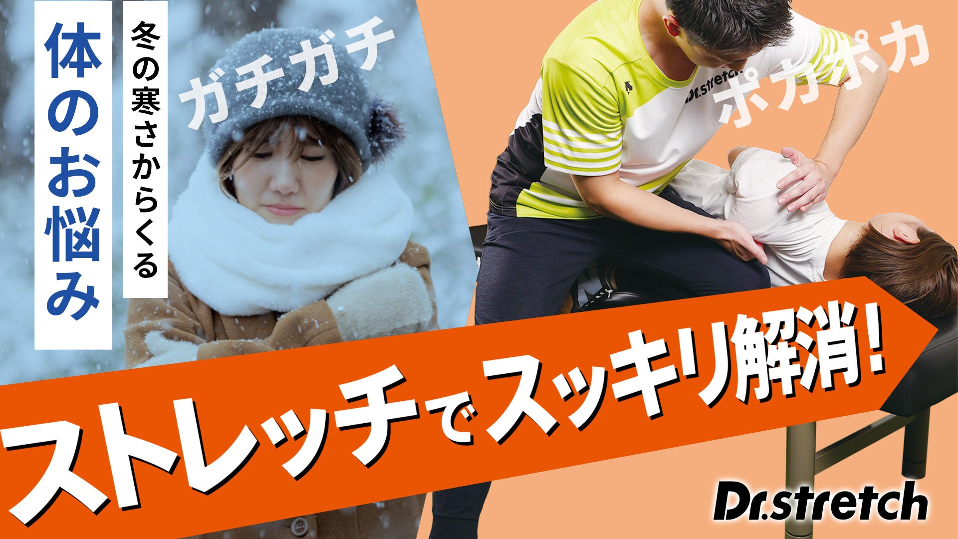 外気の寒さのために屋内で過ごす時間が増える時期。さらに忘年会、年末年始の帰省、新年会と屋内でのイベントも続いて、体を動かす機会が減少傾向になります。今回『やみつき!ストレッチ総選挙』で上位にランクインしたストレッチのほかにも、ストレッチ専門店Dr.stretchでは全身の動きを改善するストレッチメニューを、一人ひとりの体の状態にあわせて提供しています。