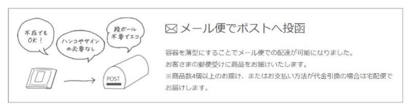 商品パッケージを小型にすることで、メール便での商品発送を可能としています。これによって配送にかかる環境負荷を低減するだけでなく、お客さまの受取り時の利便性も向上しています。