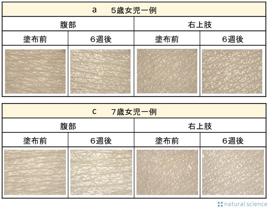 4歳から10歳の幼児と学童において、洗浄と保湿のスキンケアを介入したところ、皮膚所見と機器測定の結果からスキンケアにより保湿効果が高まり、乾燥や落屑の症状が減少し皮膚状態が改善することが確認されました。