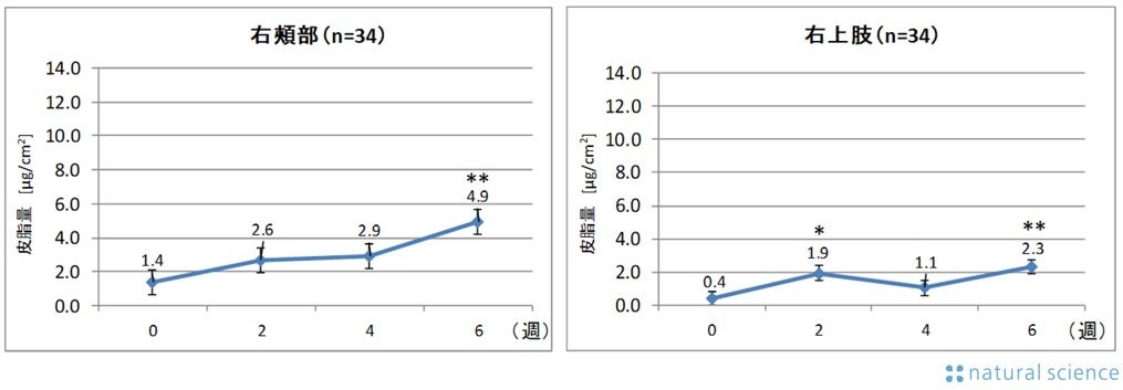 機器測定ではスキンケア介入後は、角層水分量や皮脂量が増加していました。