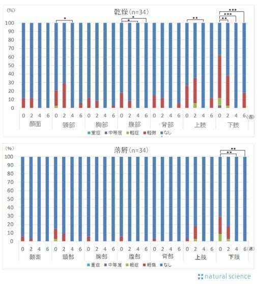 皮膚所見では、介入前の皮膚状態は首や腕、脚に乾燥と落屑が見られた児が多く見られましたが、スキンケア介入後は乾燥や落屑が有意に減少しました。