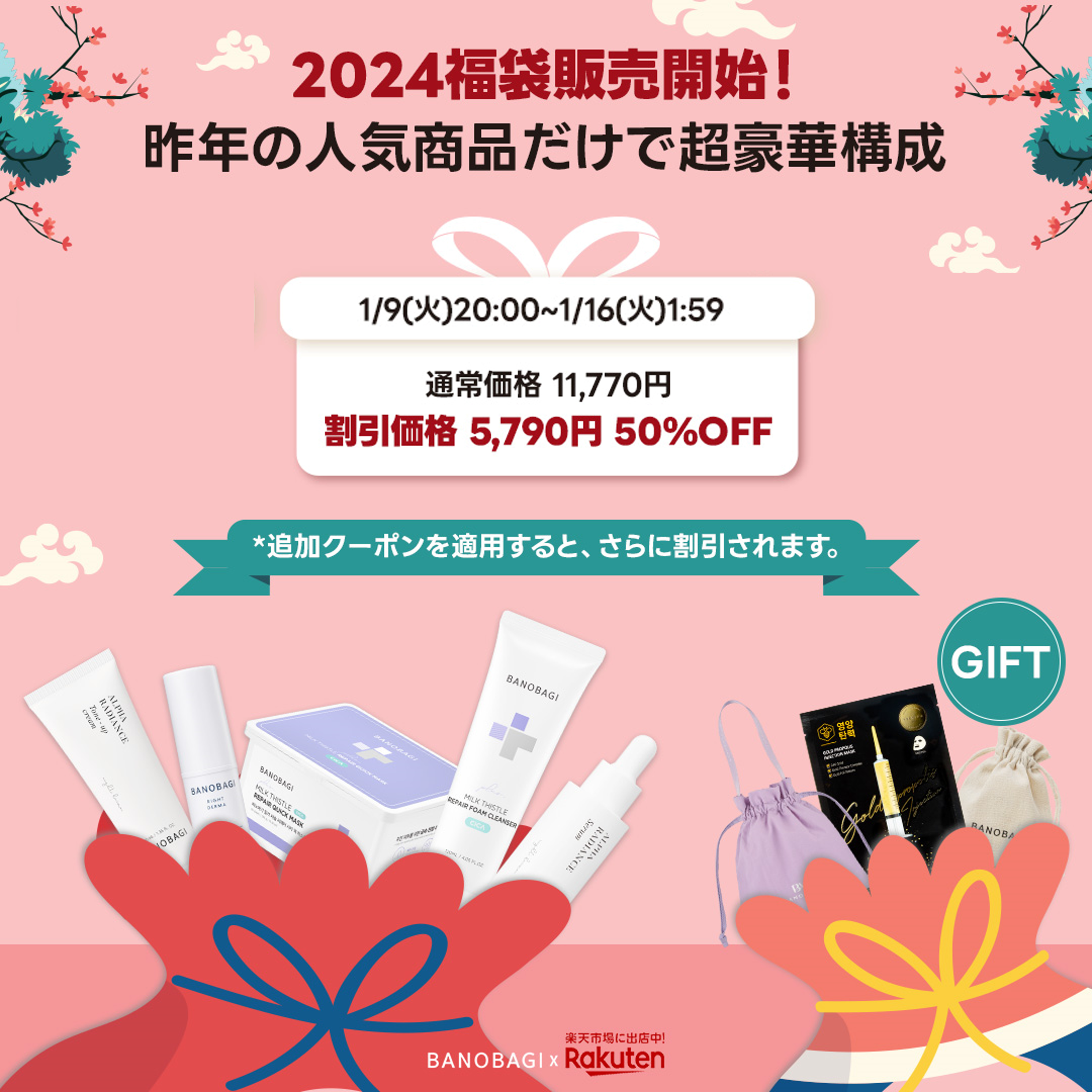 2024 バノバギ福袋は昨年一年間多く愛されたベスト商品のみで構成されています。 人気インフルエンサーが好んで使用し、オンライン上で大きな話題となった急速リラクシング大容量マスクパック「ミルクシスルシカクイックシートマスクプラス」と美肌の超進化アルファアルブチン成分で肌を清くきれいにケアしてくれる「アルファラディアンスセラムとトーンアップクリーム」、そして韓国の有名ビューティーマガジンアルーアが主催する2023ベストビューティーオブビューティーアワード[スキンケアスティック部門]でエディターズピックを受賞した弾力マルチバーム「PDRNリペアリアルバーム」が主な対象です。