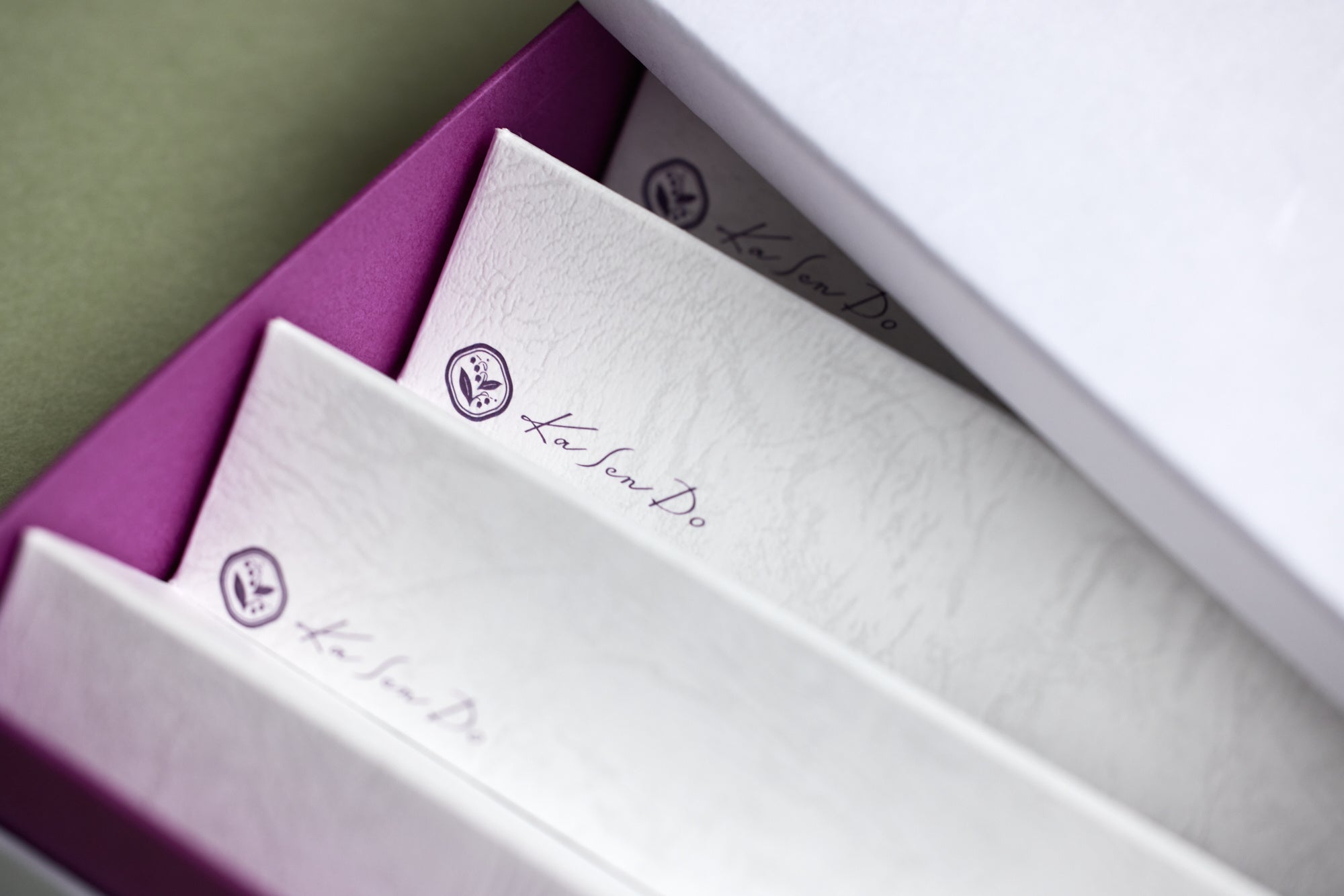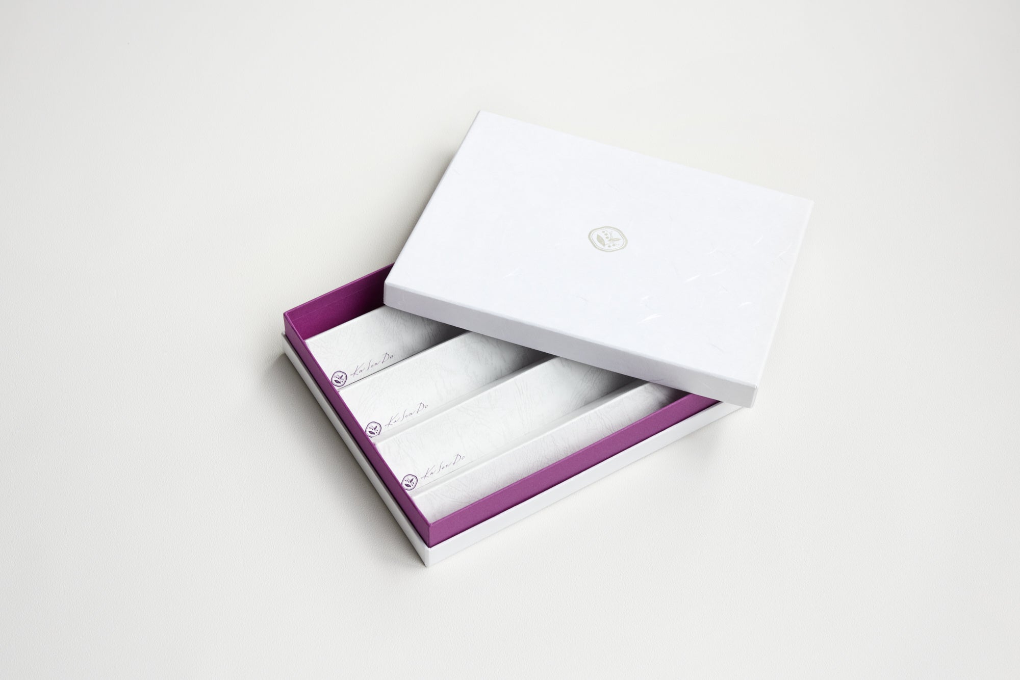 お届けの際は、一本ずつ丁寧に小箱へ。そして四本をセットにして特製の箱に。
