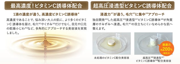 ※1肌にうるおいを与え、乾燥により目立った毛穴を目立たなくすること ※2乾燥してキメが乱れた肌 ※3乾燥による小ジワを目立たなくする(効能評価試験済み)※4エッセンスシリーズ内で、ビタミンC誘導体を最も多く配合 ※5当社内における独自原料 ※6超高圧加工処理装置を用いた原料 ※7角質層まで ※8超高圧処理したテトラヘキシルデカン酸アスコルビル(保湿成分)※9ヘキシル3-グリセリルアスコルビン酸、3-グリセリルアスコルビン酸、パルミチン酸アスコルビルリン酸3Na、パルミチン酸アスコルビル、超高圧処理したテトラヘキシルデカン酸アスコルビル(全て保湿成分)※10気になる部分に集中的に使用