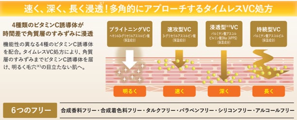 独自※⁵の超高圧※⁶浸透型※⁷ビタミンC誘導体※⁸と多角的にアプローチにするタイムレスVC処方の4種ビタミンC誘導体※⁹を最高濃度※⁴配合したVエッセンスプレミアム。