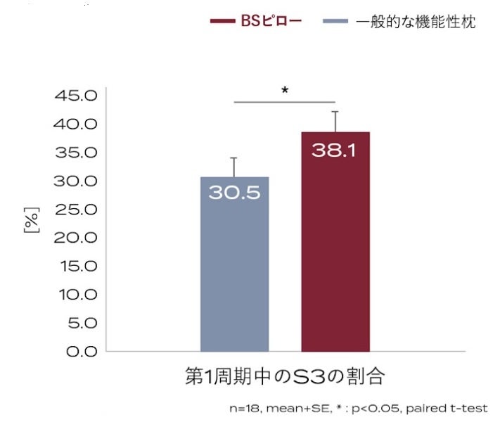 黄金の90分の中でノンレム睡眠の中でも最も深い睡眠であるS3の割合が一般的な機能性枕と比べて有意に増加しました。