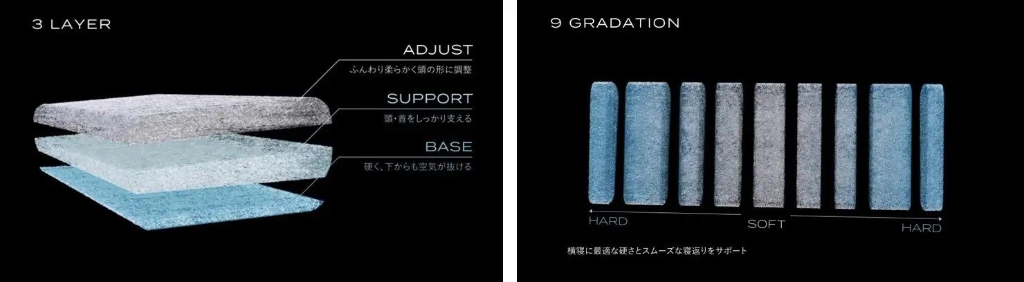 頭の大きさや重さに合わせてフィットする“アジャスト層”、頭や首をしっかり支える“サポート層”下からも空気が抜ける“ベース層”と、3種の繊維が異なる樹脂が重なった理にかなった構造になっています。首元は沈み込みやすいやわらかさに、両端は少し硬く、横向きに寝てもしっかりフィットし、寝返りが打ちやすく仕上げています。