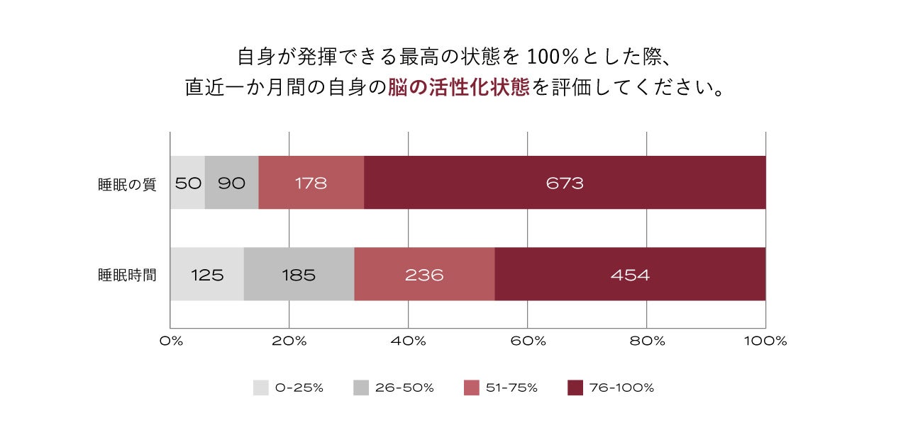 脳のパフォーマンス(脳の活性化状態)に関する主観評価について、「睡眠時間群」と「睡眠の質群」を比較した結果、「睡眠時間群」では自身の脳の活性化状態を最も自己評価の高いグループである76-100%と回答した方が1000名中454名(45.4%)に対して、「睡眠の質群」では1000名中673名(67.3%)と21.9ポイント高く、睡眠の量よりも睡眠の質が、脳のパフォーマンスへの影響が強いことが推察される結果となりました。
