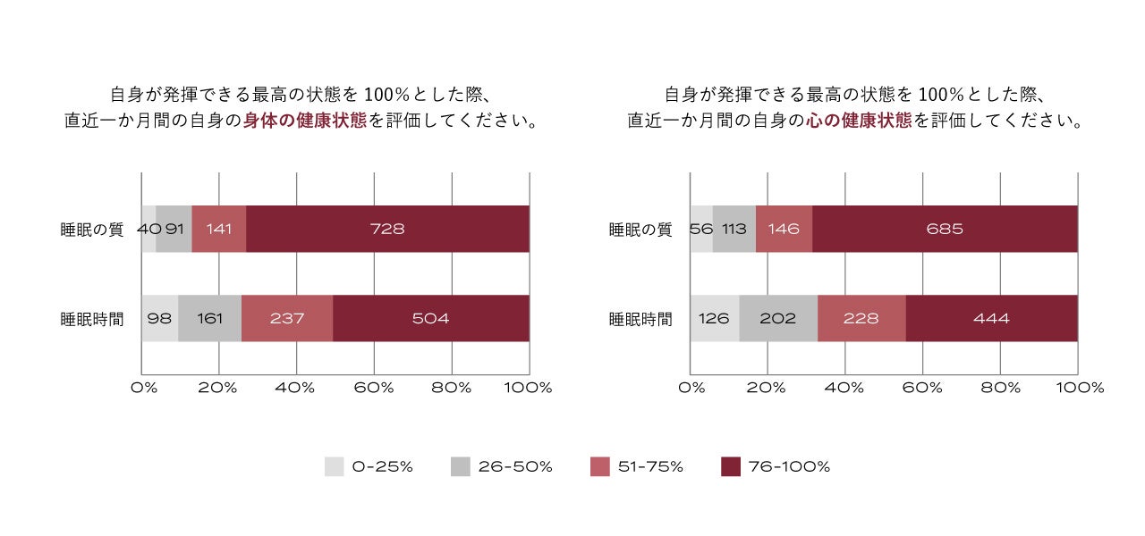 身体と心の健康状態に関する主観評価について、「睡眠時間群」と「睡眠の質群」を比較した結果、「睡眠の質群」は、最も自己評価の高いグループである76-100%と回答した方が「身体の健康状態」では72.8%(「睡眠の時間群」対比、約1.4倍)、「心の健康状態」では68.5%(「睡眠の時間群」対比、約1.5倍)となりました。体調面やメンタル面においても、睡眠の量より睡眠の質が影響していることが推察される結果となりました。
