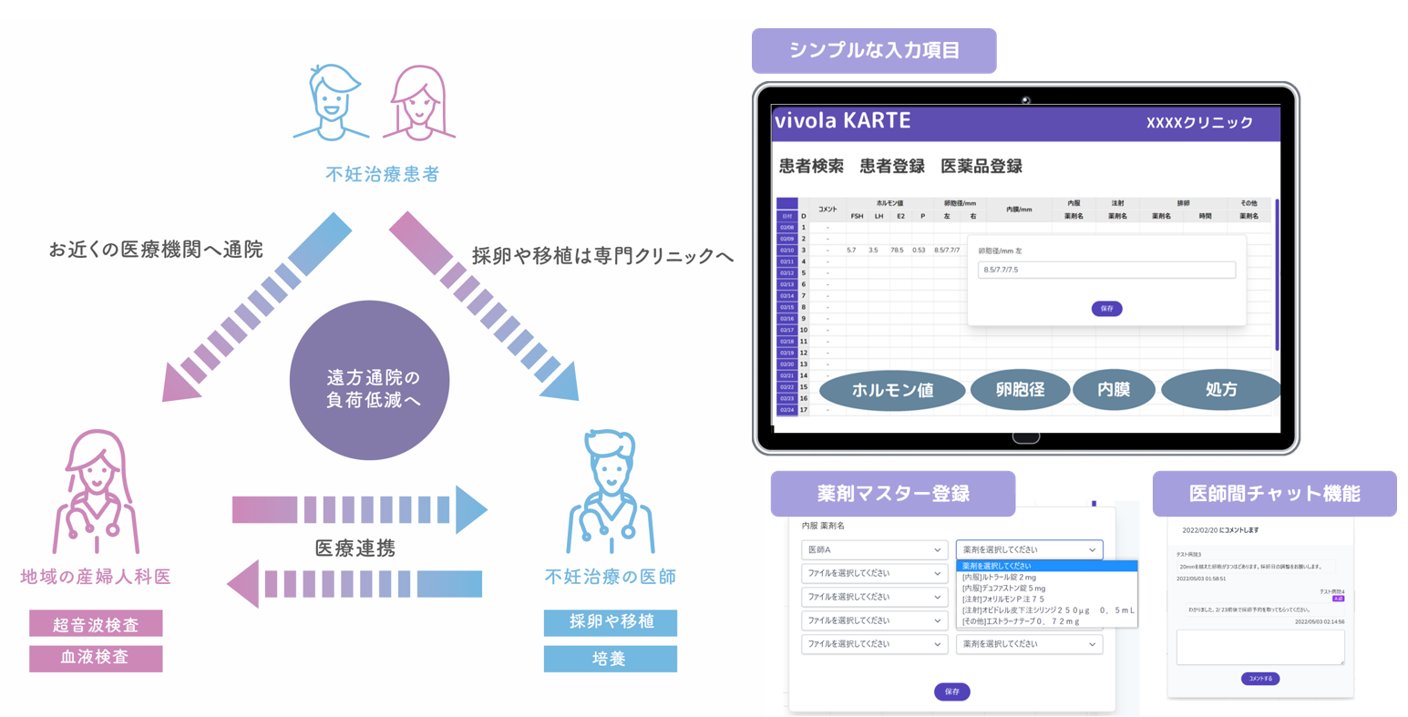 そこで、弊社では医療機関までのアクセスや通院回数や待ち時間の観点から物理的な通院時間を削減するために、地域の一般の産婦人科と不妊治療を専門とするクリニックが連携可能となる、遠隔連携システム「vivola-KARTE」を開発しました。