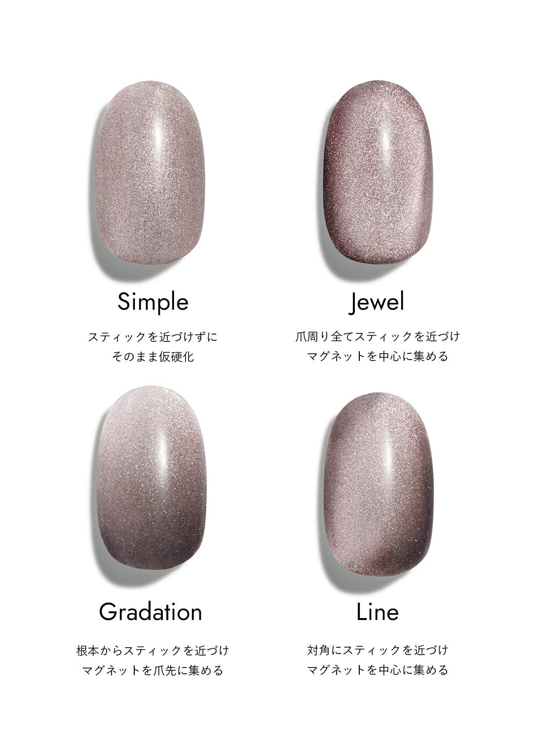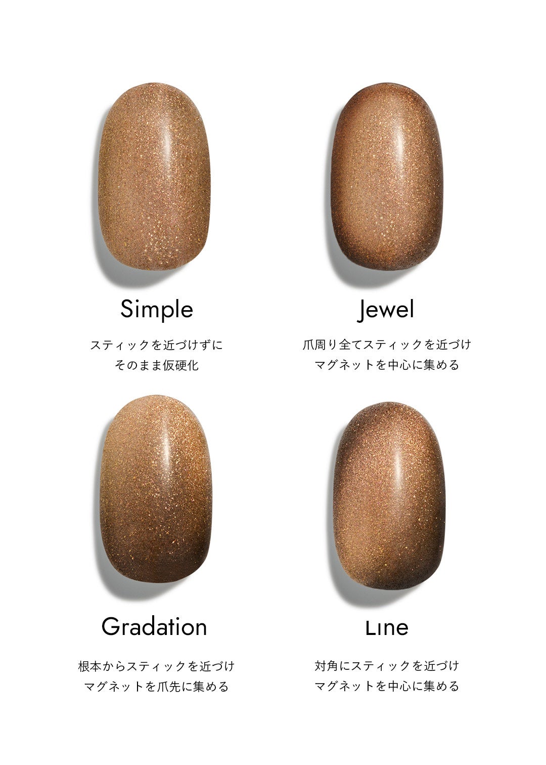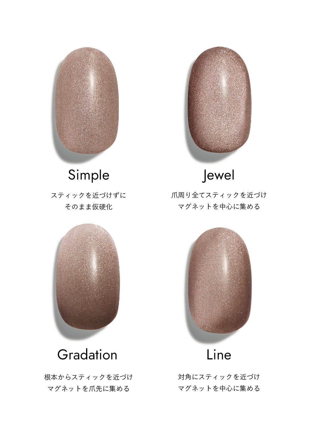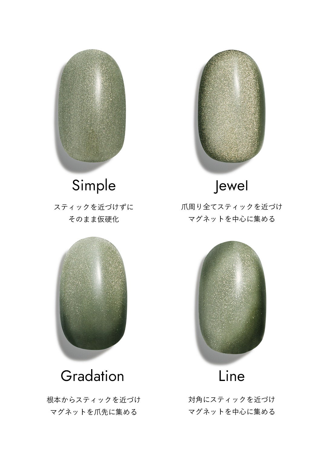 ジェルを塗って硬化する前に、マグネットスティック等の磁石を近づけることで、誰でも簡単に宝石のような奥行きのあるデザインを表現できます。