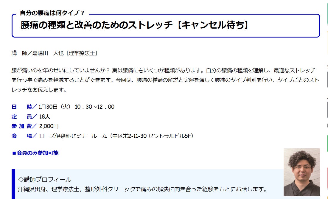 開催テーマ: 自分の腰痛は何タイプ?腰痛の種類と改善のためのストレッチ