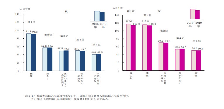 日本全体を見渡してみても、病気やケガの自覚症状がある部位の中で、腰痛が男性で第1位、女性では第2位と、症状を自覚している割合が高いです。