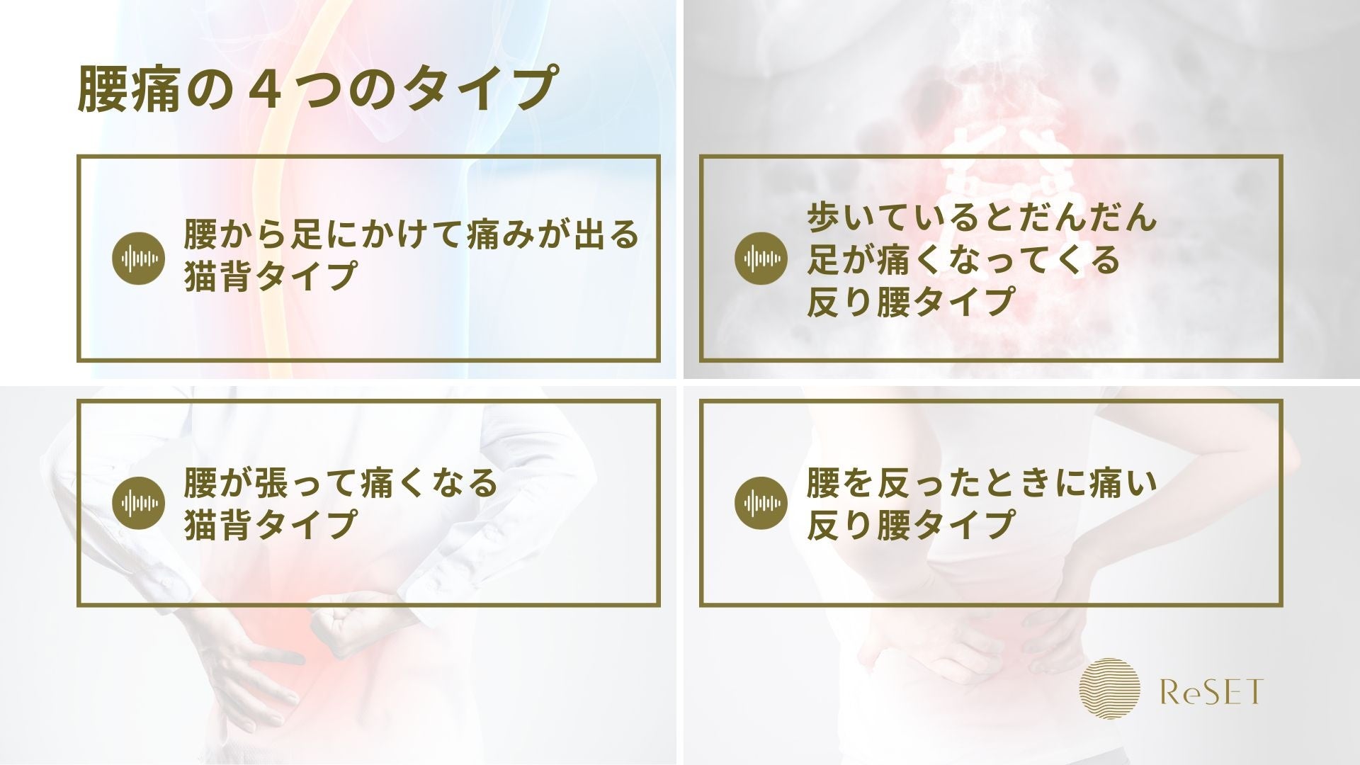 ・腰痛の種類を理解し、自分の腰痛のタイプが分かる。