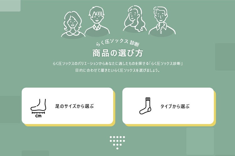 新たにオープンした「らく圧ソックス特設サイト」では「らく圧ソックス診断」を開設。バリエーション豊富な【らく圧】シリーズから着用感や目的に合った一足をお選びいただけます。