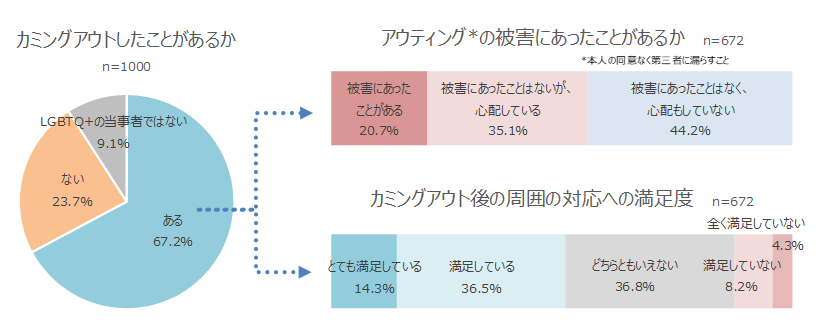 また、カミングアウトした方のうち、「アウティングの被害にあったことがある」は2割、「被害にあったことはないが、心配している」が3割で、合わせて過半数を占めました。また、カミングアウト後の周囲の対応への満足度では、「とても満足している」と「満足している」が約半数となり、約半数が満足できていないことが分かりました。