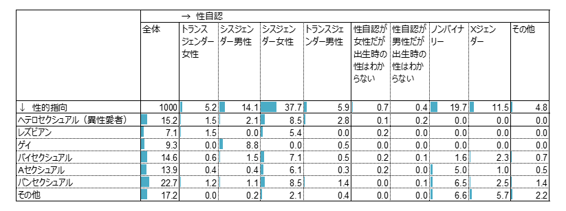 「ヘテロセクシュアル(異性愛者)」は性的指向ではマジョリティですが、そのうち多くの方の性自認がマイノリティであり、「シスジェンダー」は性自認ではマジョリティですが性的指向がマイノリティの方が多くなっています。