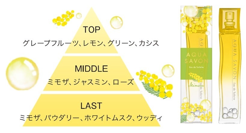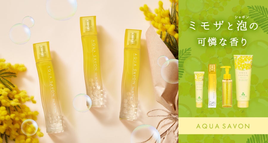 『ミモザと泡(シャボン)の可憐な香り』は、透明感のあるみずみずしいグリーンフローラルからやさしく上品なミモザをイメージしたフローラルへと表情を変える、春らしさを楽しめる香りとなっています。「アクア シャボン」ならではの、清潔感のあるシャボンの香りが調和した春季限定の香りです。