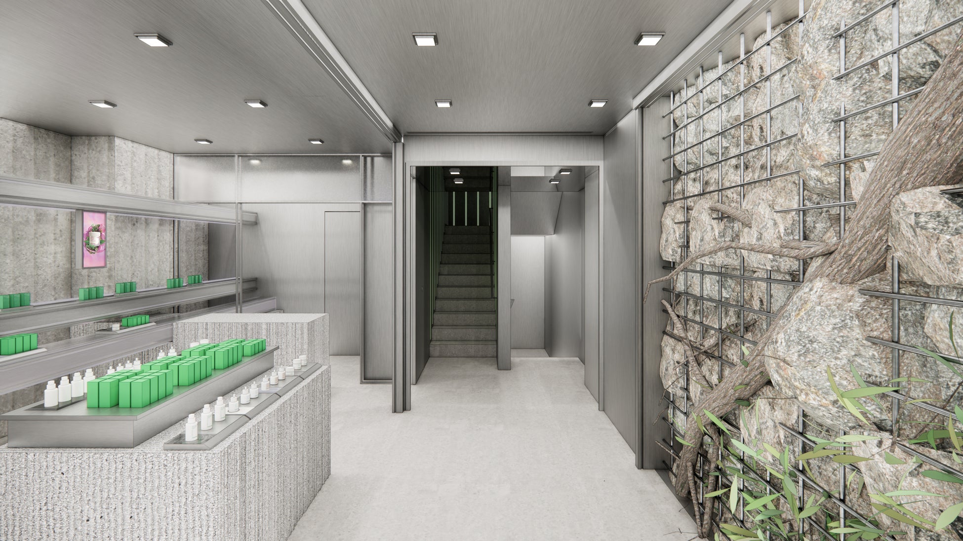 コアコンテンツを体験する空間の1階。入口の壁面には、金属の構造物と岩を突き抜けて成長する大自然の力と生命力を表現した「シグネチャーオブジェ」が出迎えます。店内はコンクリート、ステンレススチール、アクリルなどの異素材をミックスしたグレーの空間で統一され、ベルトコンベア型のディスプレイ台では、イニスフリーの歴史と記録がアクティブグリーンカラーのパッケージとプロダクトとともに見渡せます。イニスフリーの世界[The Isle(ジ アイル)]への没入感を感じながらグリーンの照明の階段を抜けると、主力商品を自由にタッチアップできる曲線状のレール型のショーケースが出迎えます。1階と連動したデザインになっている2階では、イニスフリーの日本で展開している全てのプロダクトをお試しいただけます。