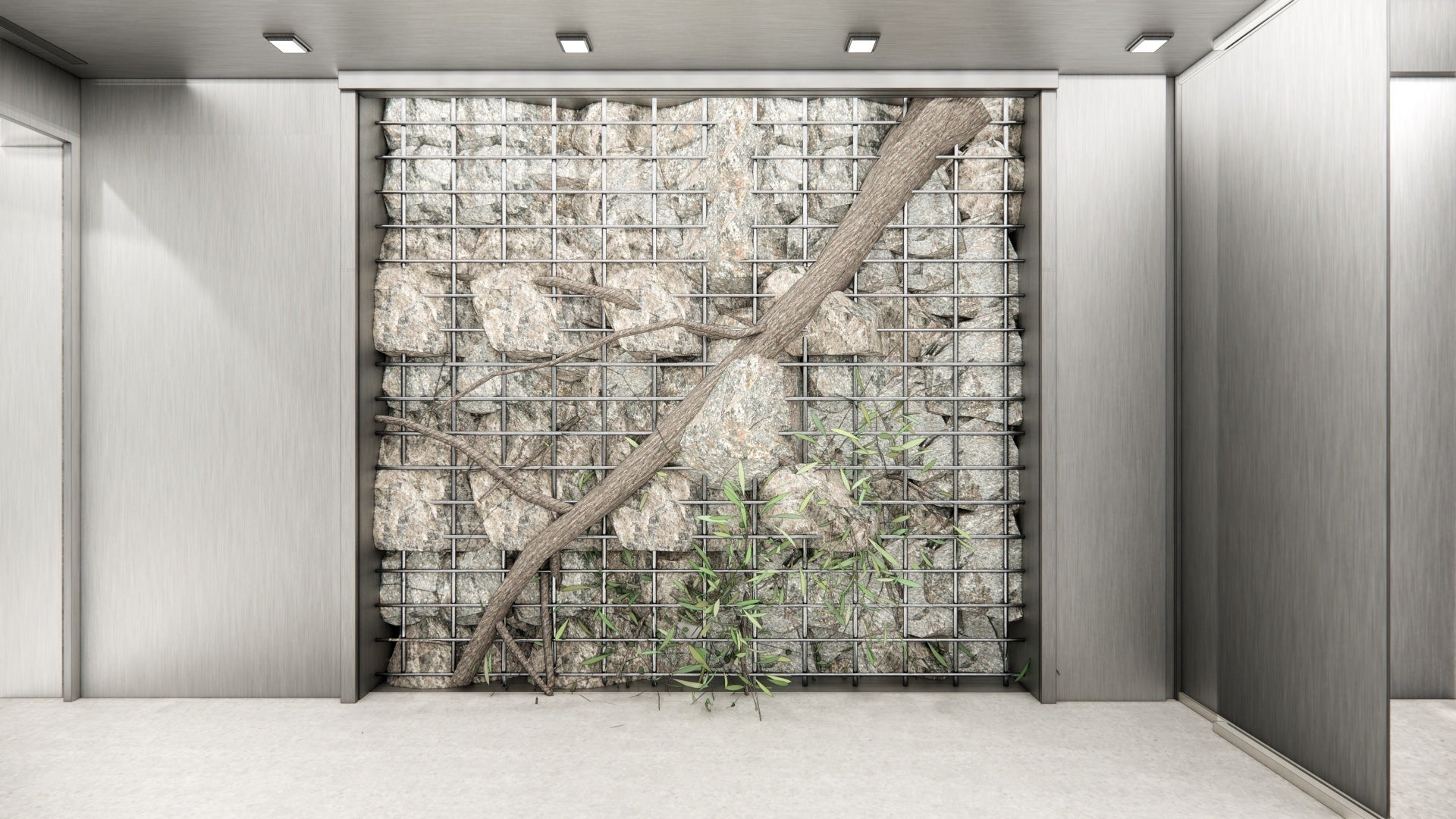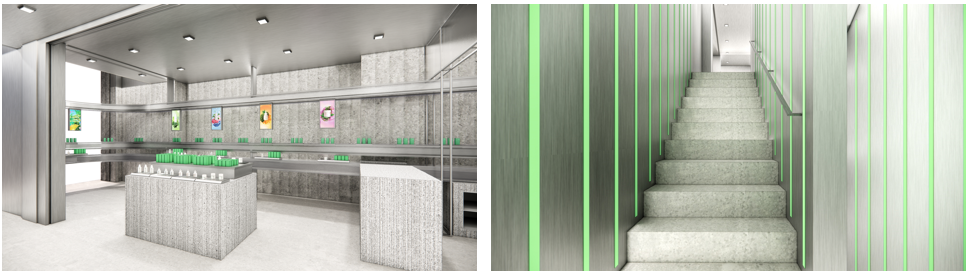 コアコンテンツを体験する空間の1階。入口の壁面には、金属の構造物と岩を突き抜けて成長する大自然の力と生命力を表現した「シグネチャーオブジェ」が出迎えます。店内はコンクリート、ステンレススチール、アクリルなどの異素材をミックスしたグレーの空間で統一され、ベルトコンベア型のディスプレイ台では、イニスフリーの歴史と記録がアクティブグリーンカラーのパッケージとプロダクトとともに見渡せます。イニスフリーの世界[The Isle(ジ アイル)]への没入感を感じながらグリーンの照明の階段を抜けると、主力商品を自由にタッチアップできる曲線状のレール型のショーケースが出迎えます。1階と連動したデザインになっている2階では、イニスフリーの日本で展開している全てのプロダクトをお試しいただけます。