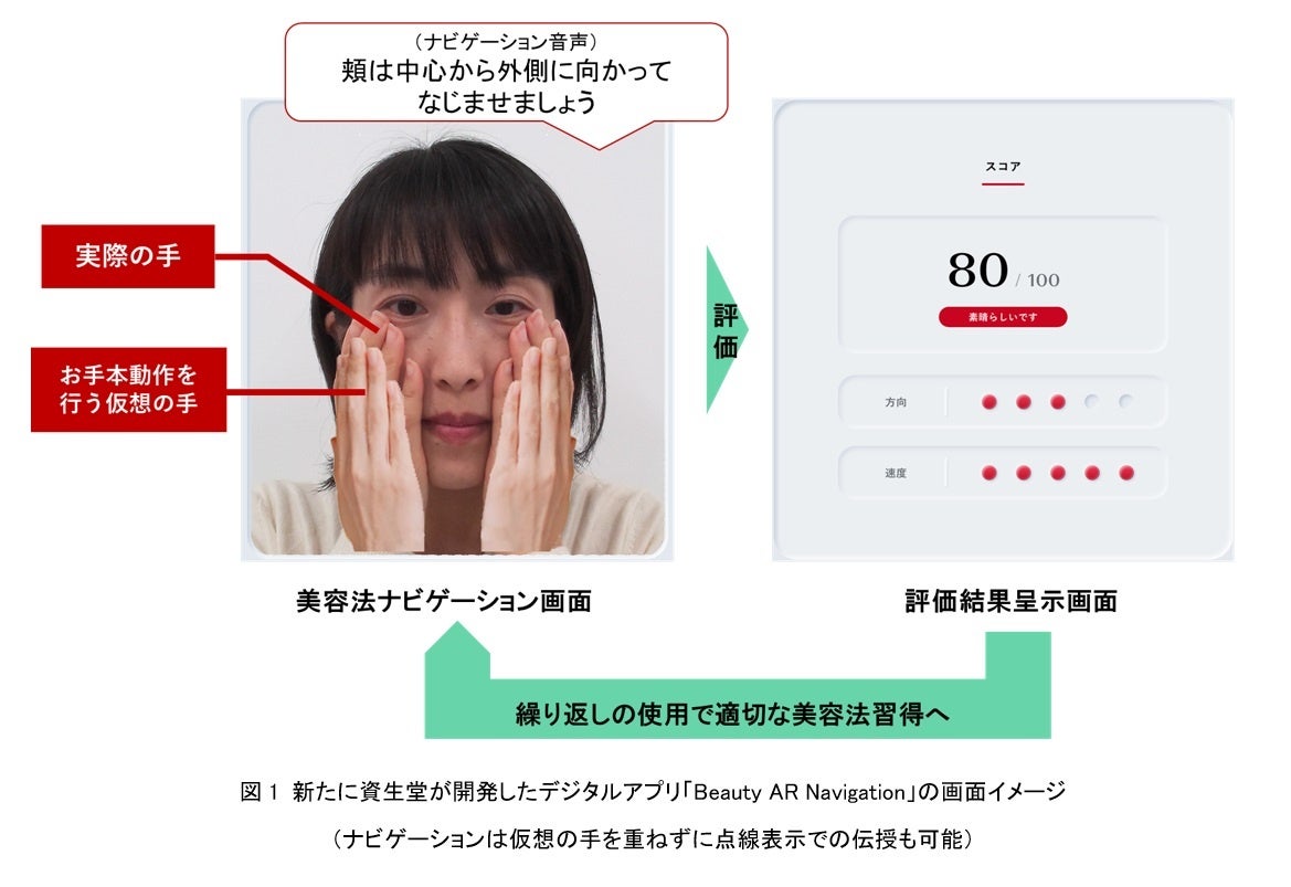 資生堂は、150年を超える歴史の中で培ってきた美容法や感性科学領域の知見と、AIを用いた微細な手の動きを検出する動作認識技術を活用し、美容法の伝授が対面でできないような場所であっても、スマートフォンやタブレット端末などを用いてインタラクティブにお客さまの適切な美容法の習得と実践をサポートすることができるデジタルアプリケーションシステム「Beauty AR Navigation」を開発しました。本アプリケーションを用いることにより、お客さまは動画やナレーションでわかりやすく適切な美容法を実践・習得することができるほか、自身が行う美容法に対して定量的な評価を得ることも可能で、長期的な美容法習得のモチベーションを上げることが期待できます。
