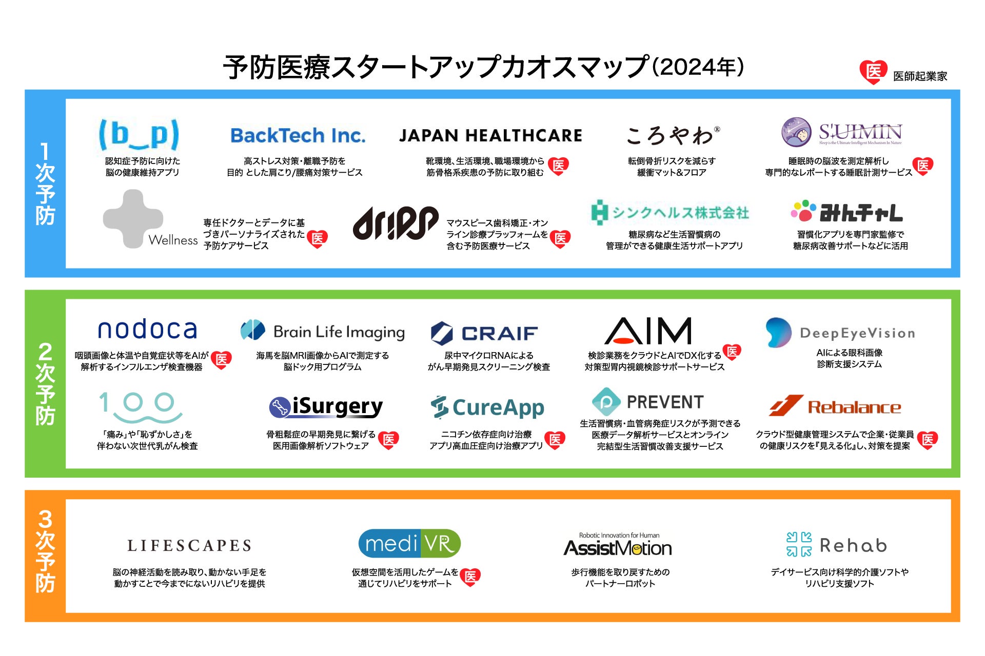 実際に予防医療スタートアップカオスマップに掲載されている23社のうち、10社が医師出身者が代表を務める企業です。ビジネスを通じてより幅広いアプローチで予防医療に貢献したいと考える医師が増えている傾向が読み取れます。