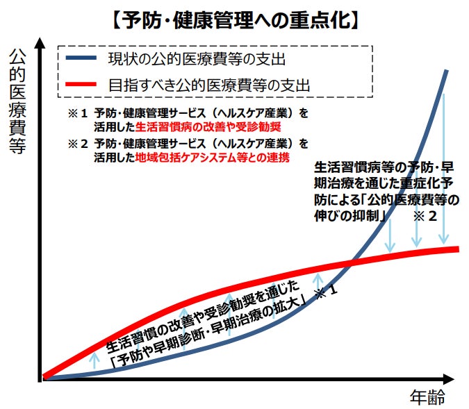 経済産業省は、予防政策によって長生きしながら生涯医療費を削減できるという方針を打ち立てています。2018年に開かれた第7回「次世代ヘルスケア産業協議会」の資料では、「予防・健康管理への重点化」によって、高齢者の医療費が半分以下に減少するという図を示しています。