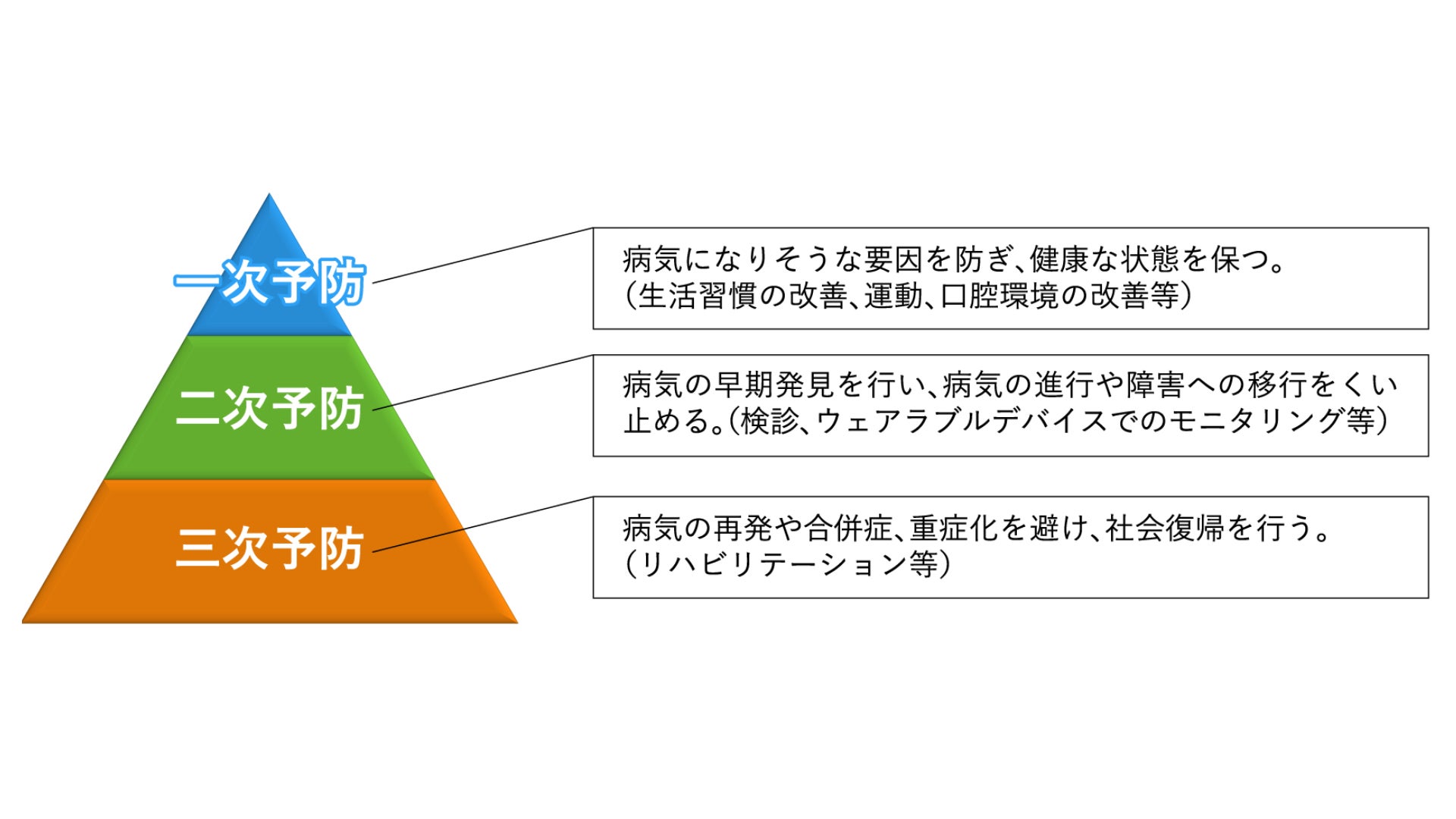 2次予防:病気の早期発見を行い、病気の進行や障害への移行をくい止める。(検診、ウェアラブルデバイスでのモニタリング等)