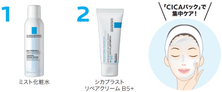特に乾燥や肌荒れ(*5)が気になる夜は、洗顔後、ターマルウォーターを肌にふりかけて、最後にシカプラスト リペアクリームでパックするシンプルステップもオススメです。寝る前にパール粒大2個くらいの量をお顔に塗布し、気になるところには少量ずつ重ねて「CICAパック」で集中ケア!