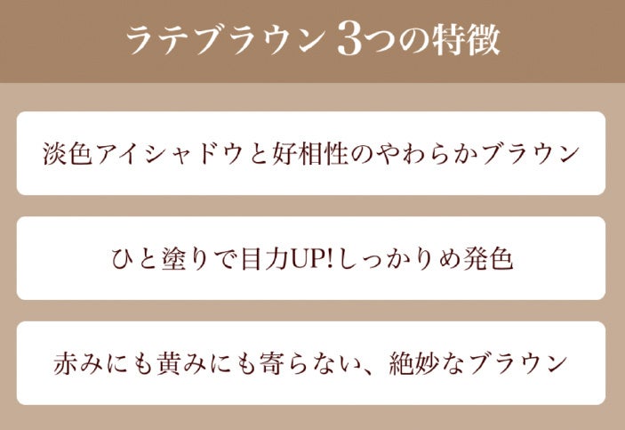 カフェラテのようなやわらかブラウンカラーで、淡色のアイシャドウから浮かずに、目力も叶える。赤みにも黄みにもよらない絶妙カラー。
