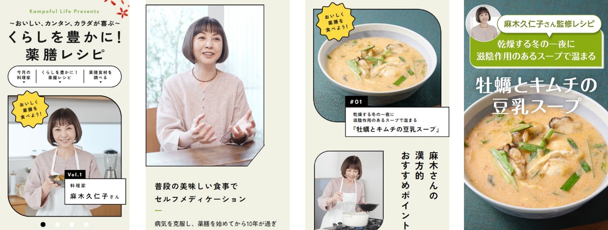 今回新たに追加された「薬膳レシピコーナー」では、第一弾として麻木久仁子さん考案の薬膳レシピ4種を公開します。乾燥する冬の一夜に作りたい滋養たっぷりの温かな「牡蠣とキムチの豆乳スープ」や、炊飯器で手軽に作れる「海老とくるみのターメリックライス」など、カラダが喜ぶおいしいカンタンレシピが満載です。
