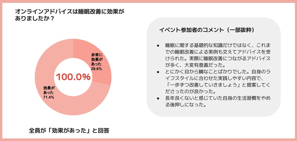 更に、オンラインによる睡眠改善アドバイスに対しては、参加者全員から「効果があった」と回答。 「これまでの睡眠改善による実例も交えてアドバイスを受けられ、睡眠改善につながった」「自身のライフスタイルに合わせた実践しやすい内容で内容のアドバイスを得られたことが良かった」など、参加者個人に寄り添ったアドバイスを評価するお声が多数寄せられました。