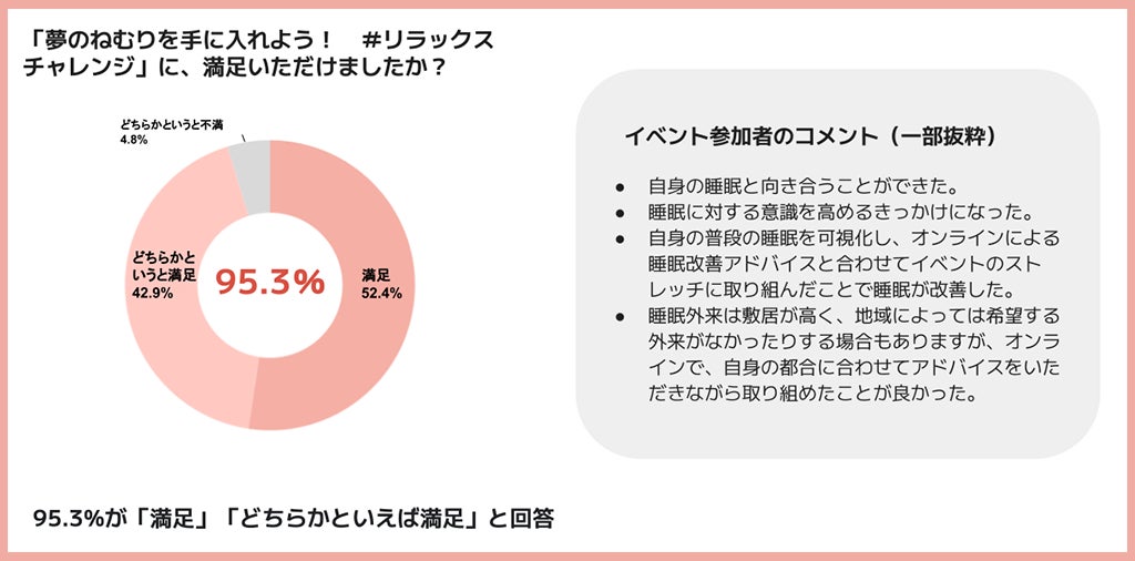 イベント終了時に参加者に行ったアンケートでは、「夢のねむりを手に入れよう! #リラックスチャレンジ」に、95.3%が「満足」「どちらかといえば満足」と回答。