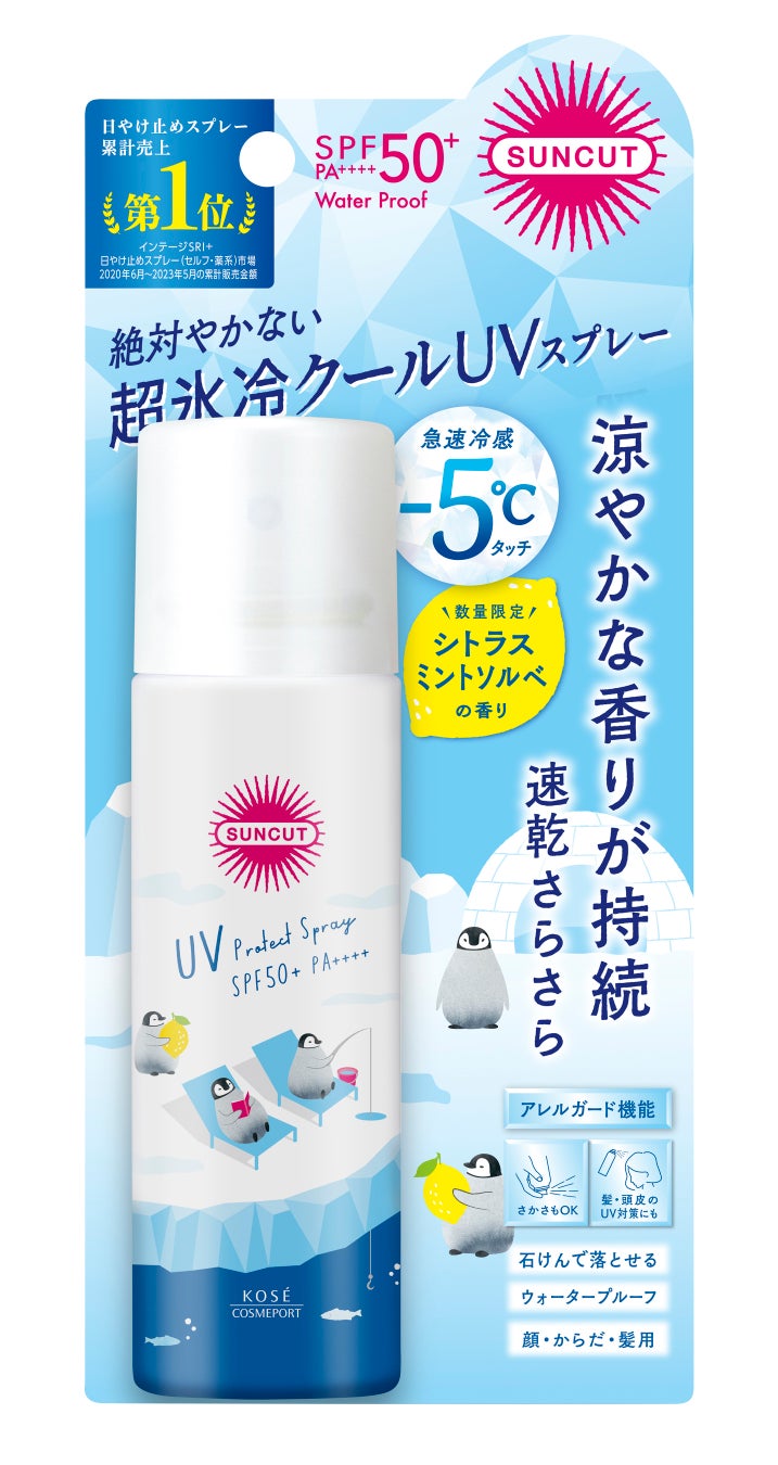 『サンカット®』は、「絶対やかない!」日やけ止めブランドとして2009年に誕生しました。誕生以来、日やけ止めに求められる確かな紫外線カット効果や心地よい使用感だけでなく、日常生活の紫外線対策を見つめ、簡便性に優れた剤型の開発、髪まで含めた全身の紫外線ケアが支持を集め、性別や年齢、国境を越えて愛されています。「UVスプレー」は日やけ止めスプレー累計売上第一位※1、ブランドを代表するアイテムです。