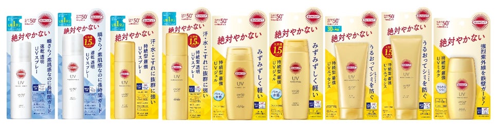 ブランド誕生から15周年に向けて、最強※2UVカット効果はそのままに耐久力と心地よい使用感を追求し改良致しました。「パーフェクトUVシリーズ」は、「スーパーストレッチフィット処方」を採用し耐久力を高めました※3。肌にしっかり密着し、汗・水・こすれ・動きに強く抜群に落ちにくく、UVカット効果が長時間持続します。みずみずしく軽いジェルタイプ、髪にも使えるスプレータイプ、うるおい感のある使用感が特長のエッセンスタイプ、さらさら感が続くミルクタイプをラインナップしています。「プロテクトUV スプレー」は「エクストラエアリーフィット処方」を採用し速乾性とさらさら感を高めました※3。瞬時に乾いてムラなく密着し白浮きしない透明タイプです。