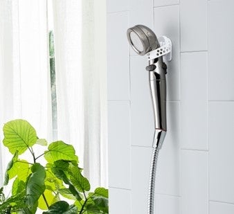 本体に内蔵されたネオジム磁石によって、マグネットがつく浴室の壁のお好きな場所にシャワーヘッドを一時的にくっつけることができるようになるので、シャワー中にちょっとシャワーヘッドを置きたい、というときにも便利です。もちろん、いつも通り本品をシャワーヘッドに装着したまま、備え付けのシャワーフックにもかけておくことも可能ですので、普段は本品をつけっぱなしでご使用いただけます。