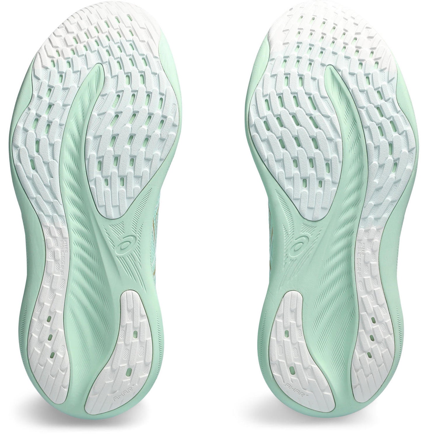 靴底は、独自開発のラバー素材2種類を配した「HYBRID ASICSGRIP(ハイブリッドアシックスグリップ)」を採用し、グリップ力と耐久性を両立させています。中部に、さまざまな路面コンディションでも優れたグリップ力を発揮する「ASICSGRIP(アシックスグリップ)」を使用し、着地や蹴り出し時に力のかかりやすいつま先部とかかと部には当社従来ラバーと比較し約3倍の耐摩耗性をもつ「AHARPLUS(エーハープラス)」を採用しています。