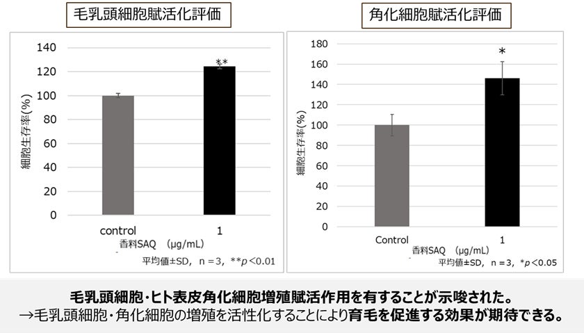 試験の結果、オリジナル香料には角化細胞、毛乳頭細胞ともに増殖させる効果が見られたことから、育毛促進作用が期待されます。