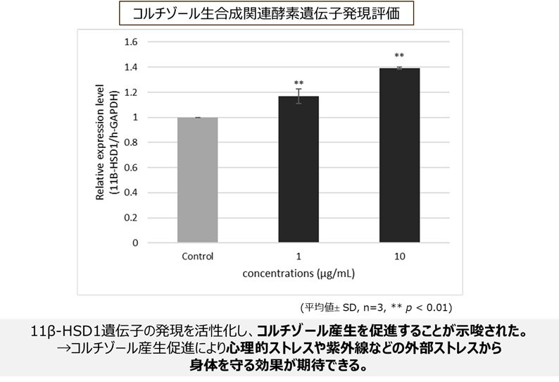 試験の結果、オリジナル香料が11β-HSD1遺伝子の発現を活性化し、コルチゾール産生を促進する効果が見られたことから、心理的ストレスや紫外線などの外部ストレスから身体を守り、ストレスの影響を緩和する効果が期待されます。