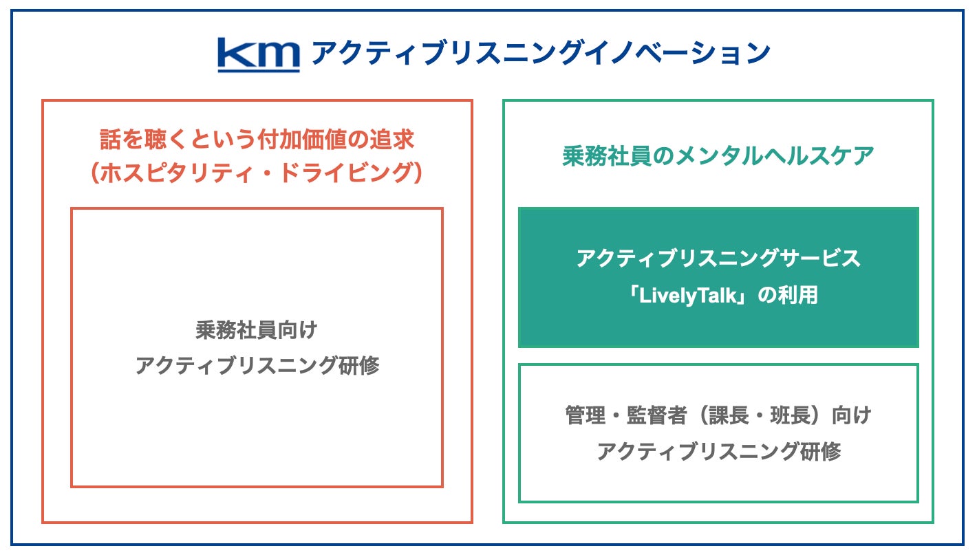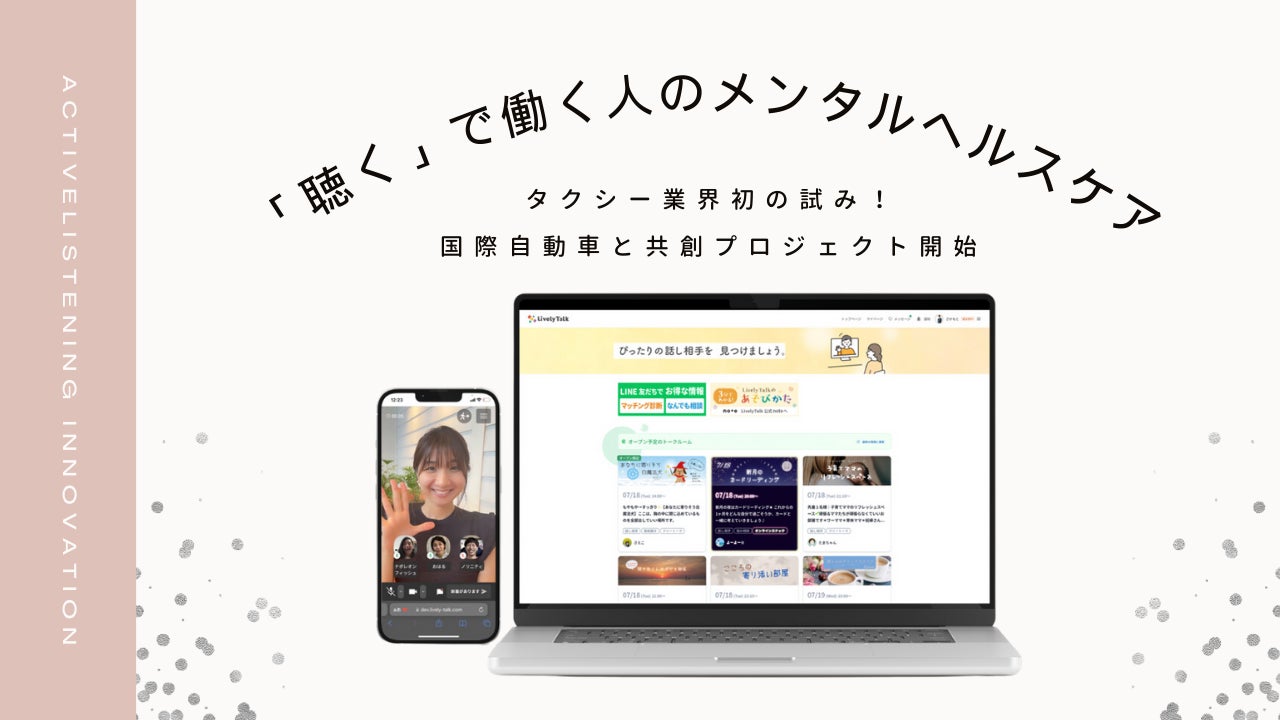 株式会社Lively(本社:神奈川県藤沢市、代表:岡 えり)は、企業で働く人のメンタルヘルスケアを目的とした、アクティブリスニングサービスの提供を開始いたします。サービス提供開始に伴い、神奈川県が実施する、大企業とベンチャー企業によるオープンイノベーション推進事業「ビジネスアクセラレーターかながわ(BAK)」の支援を受け、タクシー事業者として初の試みとなる、国際自動車株式会社(東京都港区、代表取締役社長 石井 仁)と共創プロジェクト「kmアクティブリスニングイノベーション」を開始します。