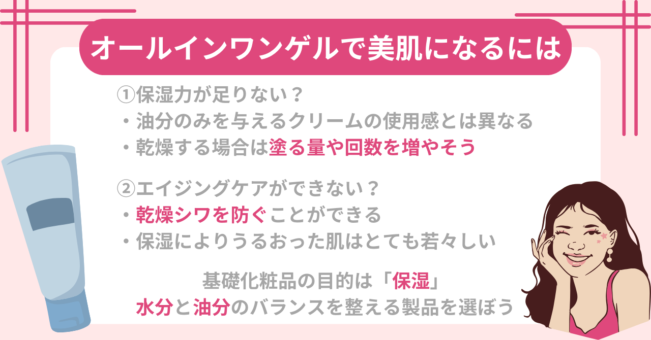 オールインワンゲルは「保湿量が足りない」「エイジングケアができない」というような不安を感じる方がいらっしゃるかもしれません。しかし、使い方次第で、そのような不安は解消されます。