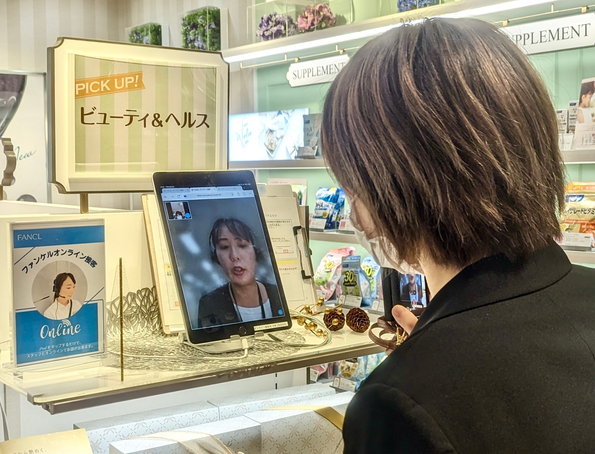 ファンケルは在宅勤務や時短勤務、フレックス勤務など、育児中の従業員が働きやすい環境を整え、誰もが安心して長く働ける環境づくりを整えています。その中で店舗スタッフが育児中の時でも自分のキャリアや接客スキルを生かしながら在宅でも働けるように、オンライン接客を導入し実証実験をスタートしました。店舗にオンライン接客専用のタブレットを置き、スタッフが忙しい時や混雑時などでも、お客様が商品について相談や質問などできるようにしています。