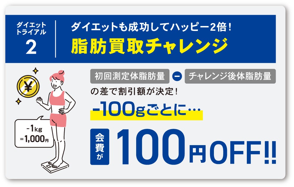 痩せた分&レッスンに参加した分だけ会費がお得になる本イベントは、新規入会者様も既存会員様もご参加可能です。ダイエットトライアルへの参加をきっかけにして、変わりたい気持ちに火をつけましょう。