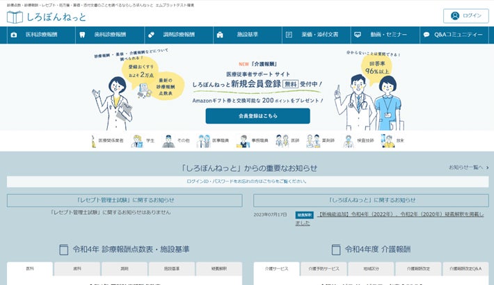 『しろぼんねっと(https://shirobon.net/)』は、医科・歯科・調剤の診療報酬に加え、施設基準や薬価・添付文書について検索・閲覧できるサイトです。サイト内にはQ&Aコミュニティも併設しており、会員になるとユーザ同士で診療報酬について自由に質問・回答することが可能です。また、会員限定で過去の診療報酬点数を調べる機能も提供しています。医師・看護師・薬剤師・病院事務長をはじめ多くの医療従事者や医療機関職員に利用されています。