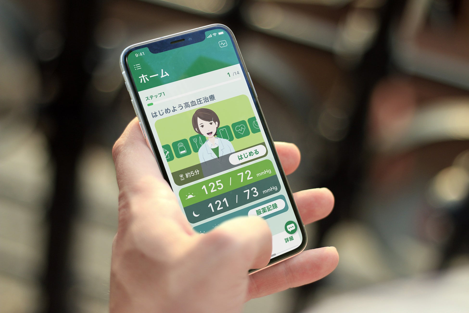CureAppが開発する高血圧症向け治療アプリと医師の指導を組み合わせて行うプログラム。病院受診時以外の日常生活において、高血圧症の正しい知識獲得のサポート、食生活や運動面でのサポートを提供しており、現在は全国1,000を超える医療機関で導入されています。