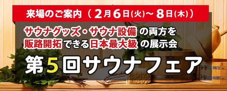 株式会社ビジネスガイド社(本社:東京都台東区、代表取締役社長:芳賀信享)は2月6日~8日、サウナ設備・グッズの両方を仕入れられる日本最大級(※1)の展示会「第5回サウナフェア」を「第15回LIFE×DESIGN」(会場:東京ビッグサイト西1、2ホール、アトリウム)内にて開催します。