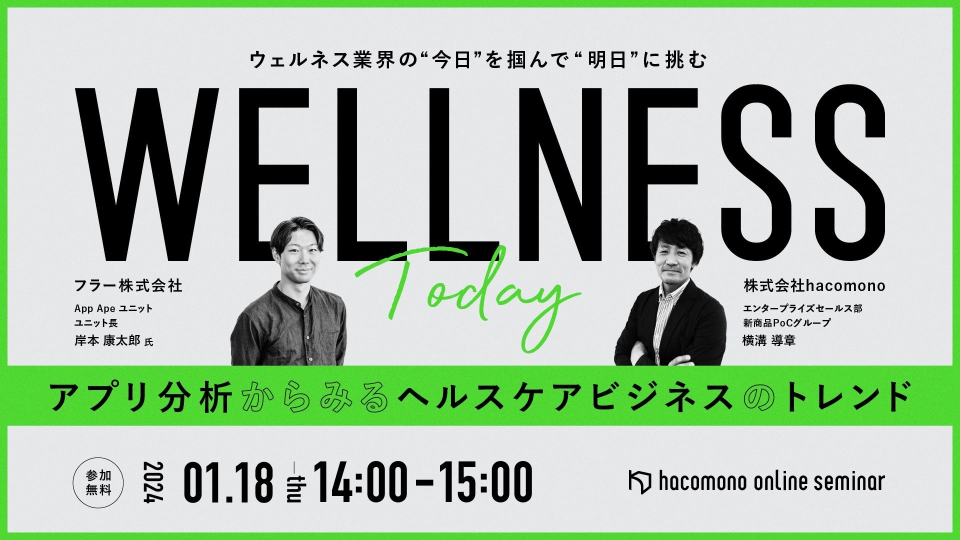 アプリ市場分析サービス「App Ape(アップ・エイプ)」を手がけるフラー株式会社(本社:新潟県新潟市、代表取締役:渋谷修太、山﨑将司、以下「フラー」)と、ウェルネス/運動施設向けオールインワンマネージメントシステム「hacomono」を提供する株式会社hacomono(東京都渋谷区:代表取締役CEO 蓮田 健一 以下、hacomono)は、アプリ分析からみるヘルスケアビジネスのトレンドをテーマにオンラインセミナー「WELLNESS Today」を開催します。