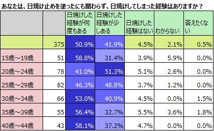 日焼け止めを使用していたのに日焼けしてしまったのは9割超。何度も日焼けしてしまったのは5割超。