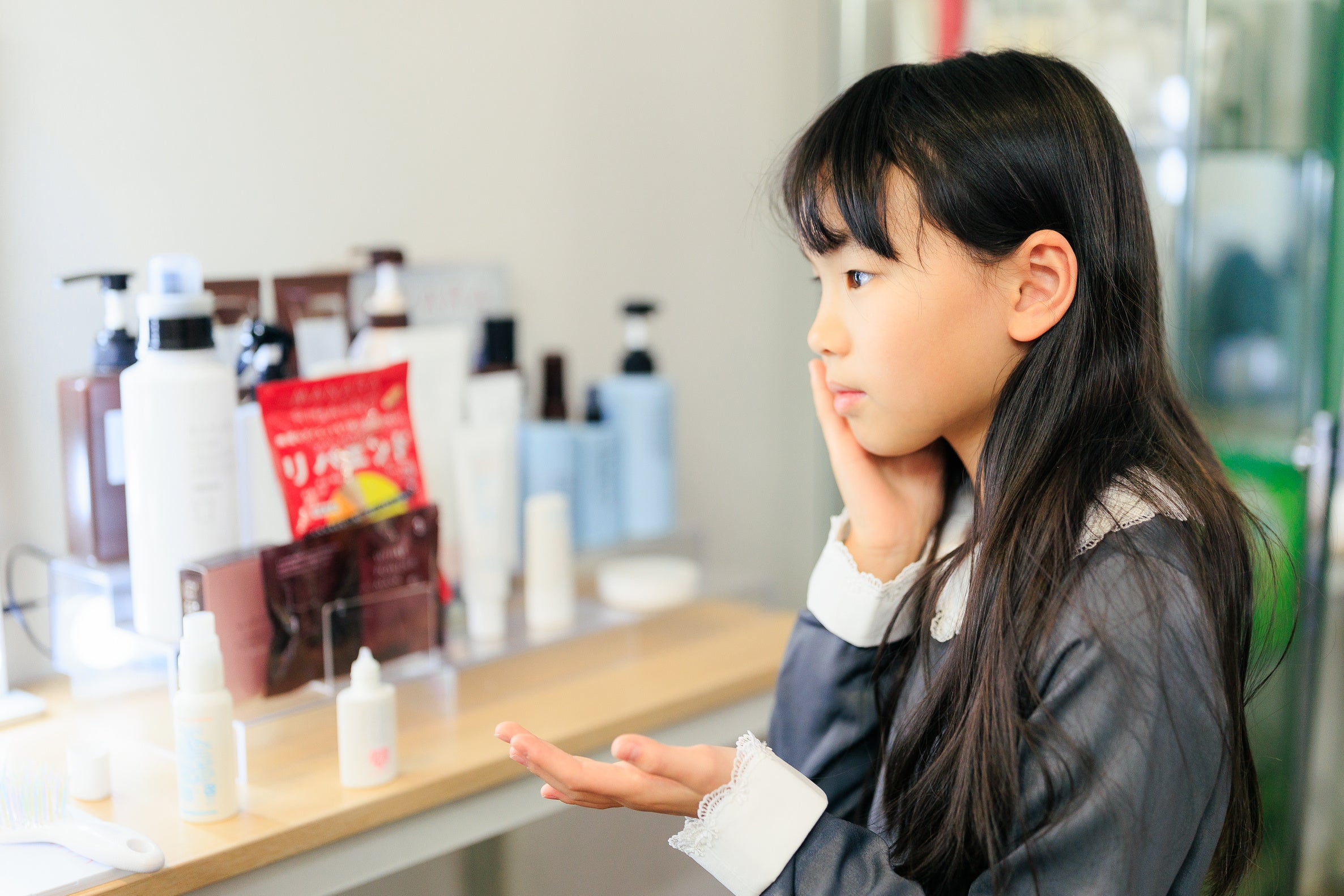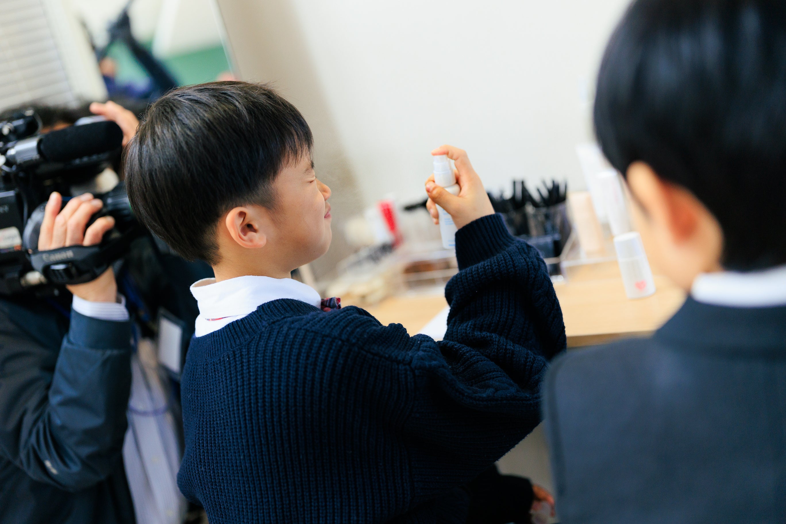 式典前には、化粧品会社ならではのプログラムとして、社員から子ども達へ簡単なスキンケアやヘアセットのレクチャーを実施。子ども達は自ら鏡の前で身だしなみを整えるチャレンジをし、仕上げは子ども達のママ(社員)が施しました。