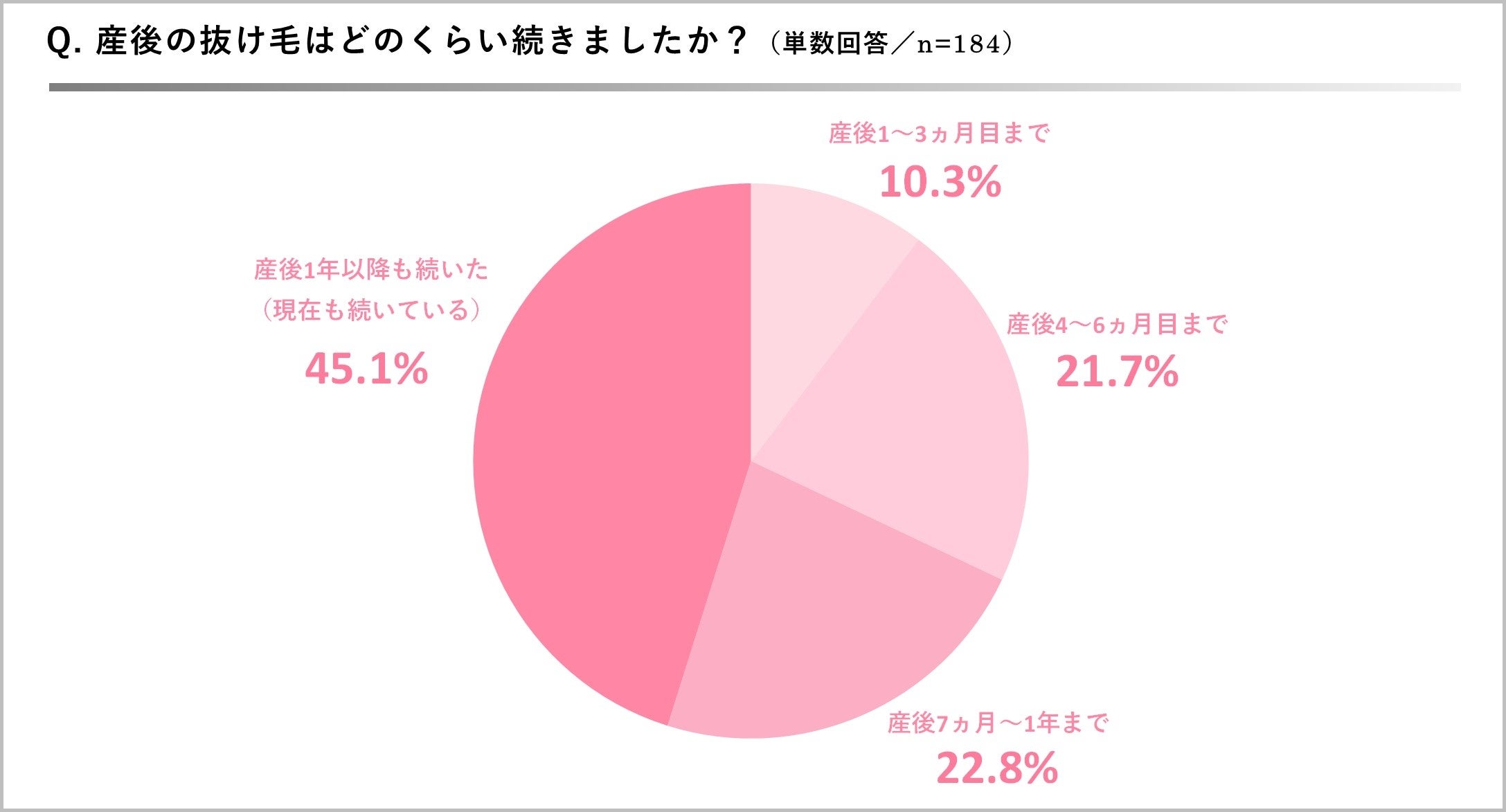 まず、産後の抜け毛がどのくらい続いたか尋ねたところ、45.1%の方が「産後1年以降も続いた」と回答しました。「産後7ヵ月~1年まで」と答えた方も22.8%に及んでおり、約7割近い方が、半年以上にわたって抜け毛の症状を感じていたことが分かりました。